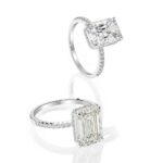This elegant women’s solitaire engagement ring features an 11×8mm emerald-cut stone with a refined hidden halo setting, offering a perfect balance of classic beauty and modern sophistication.